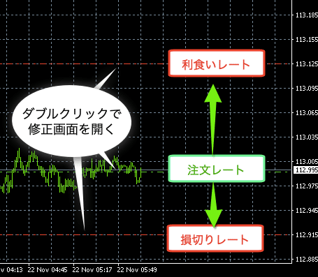 ワンクリックトレードをONにしていれば、注文画面は表示されずそのまま指値・逆指値注文が入ります。だいたいの場所で注文を入れてから、チャート上のラインやターミナルの注文内容をダブルクリックして修正画面を開き、あとからレートを微調整しても良いでしょう。