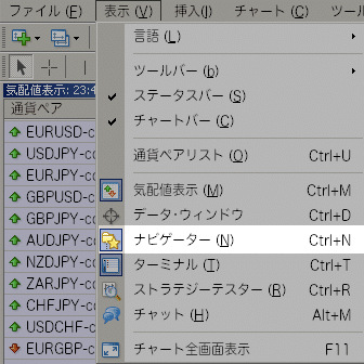 ナビゲーターは、アカウントの切り替えやツールをチャートに追加する際に利用します。