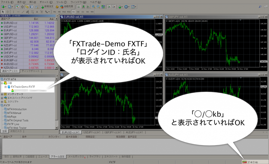 自動的にログイン画面が表示されるので、先ほどの「ログインID」「パスワード」を入力、サーバーは「FXTrade-Demo FXTF」を選択し、「ログイン」をクリックします。ログイン後、一度MT4は閉じてください。