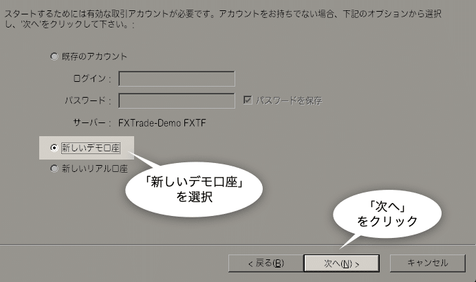 インストールしたMT4を開いてください。初回起動時は、自動的に以下の「デモ口座の申請」画面が表示されます。「新しいデモ口座」を選択し「次へ」をクリックしてください。