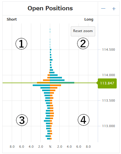 真ん中のグリーンのラインは現在価格です。現在価格を挟んで上下、左がショートポジション、右がロングポジションの4つのエリアで分類されます。