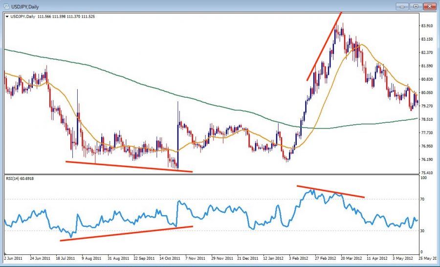 レートは下落(もしくは上昇)しているのに対し、RSIは逆に上昇(もしくは下落)しているのがわかります。