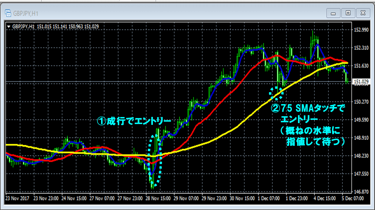 1時間足の単純移動平均線(期間75)でエントリーした場合