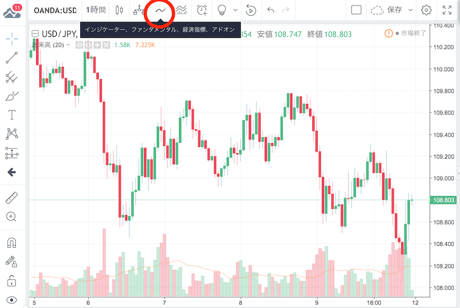 これでドル円のチャートが表示されるので、次にテクニカル分析を追加します。